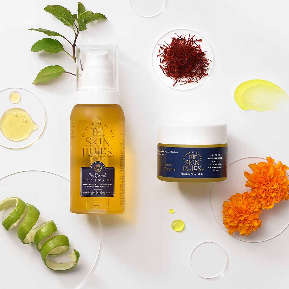 Experience the potency of daily usage of our Saffron-Infused Tan Removal Facewash and Flawless Skin Gel. 6X the effectiveness with our unique proprietary blend of plant-based extracts, elevating your skincare routine to new heights of radiance and rejuvenation.